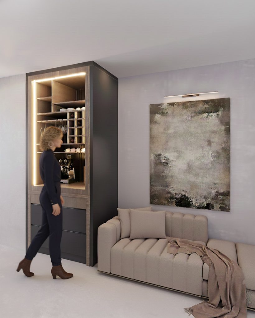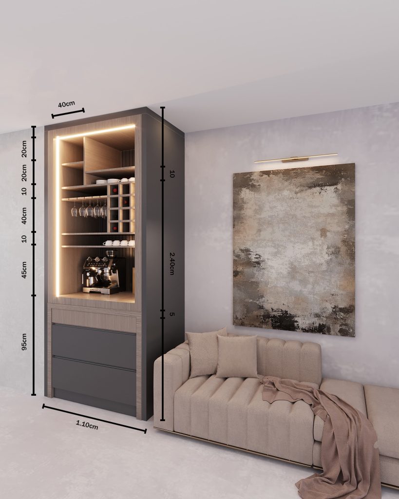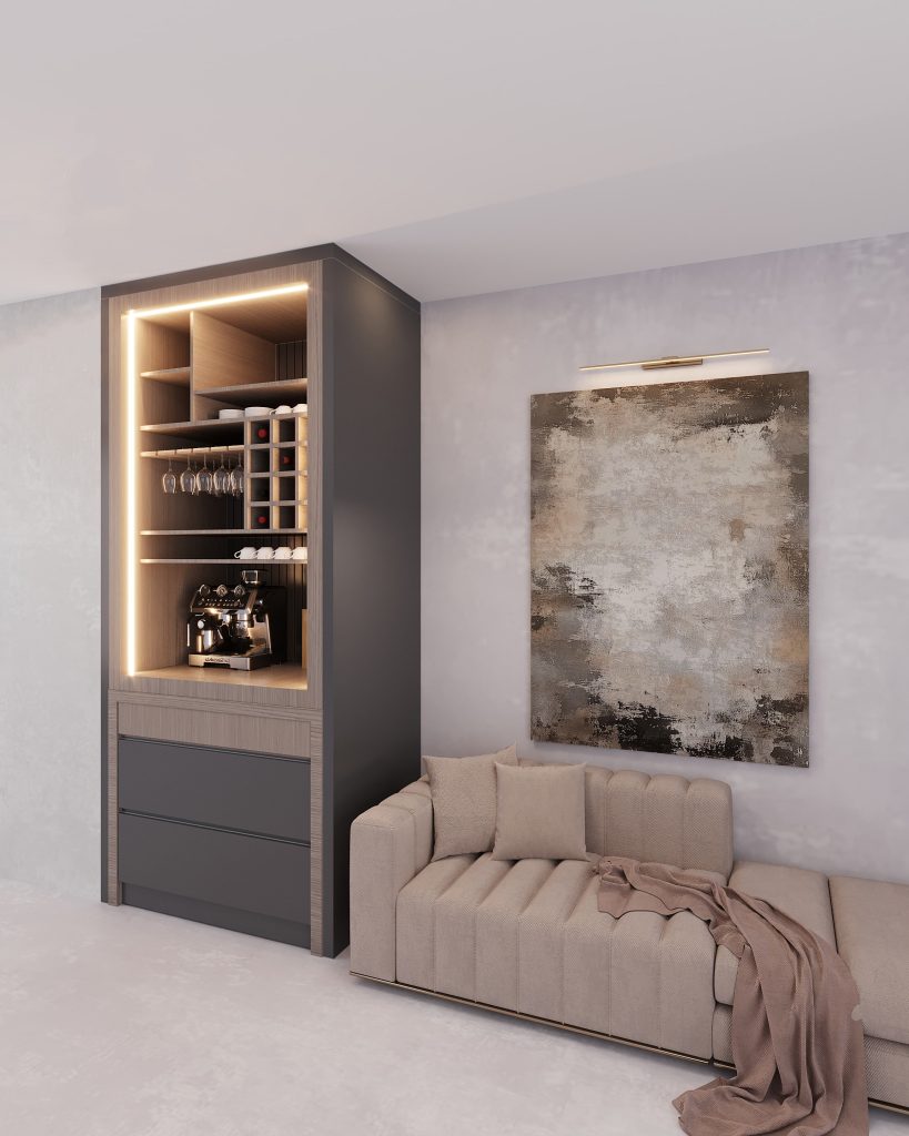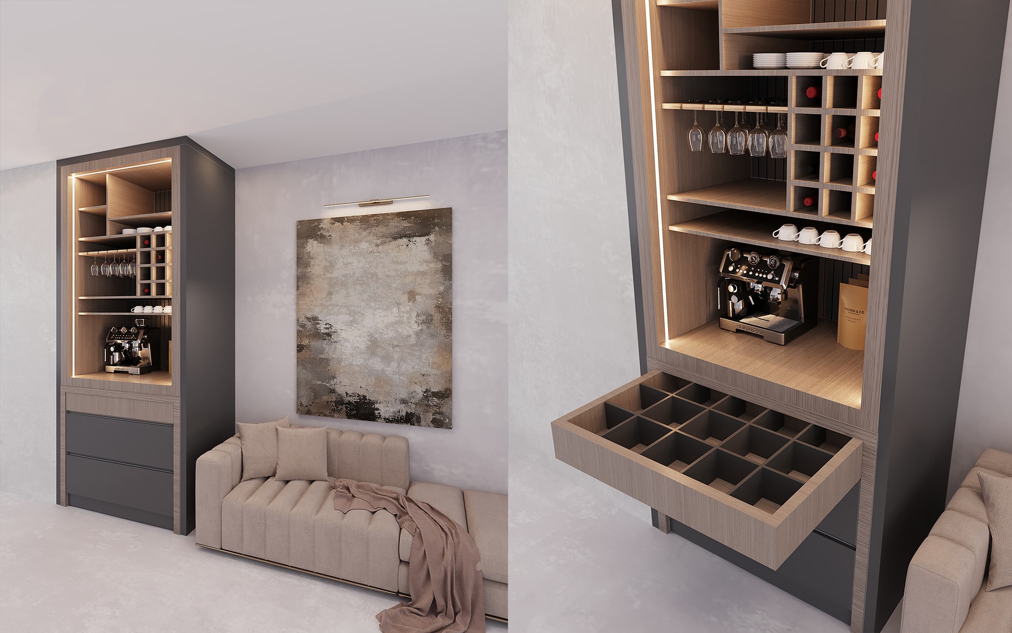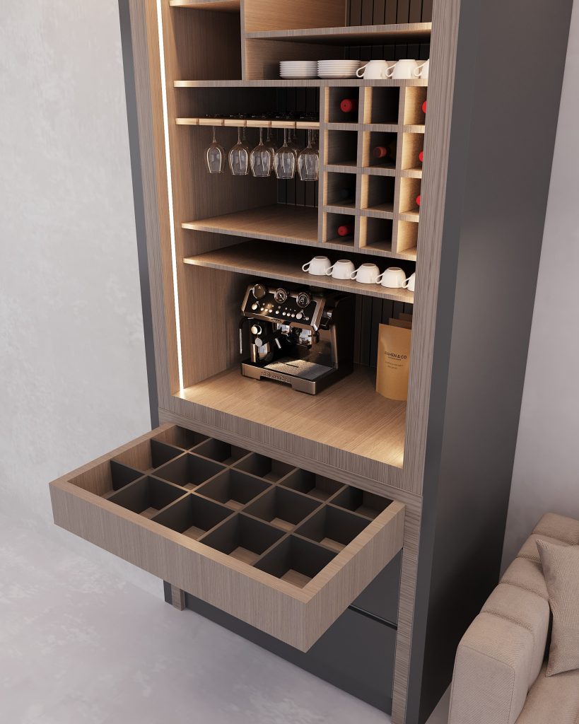 - کافیبار کوچک داخل یک ماژول کشویی یا کمد مخفی برای فضاهای جمعوجور